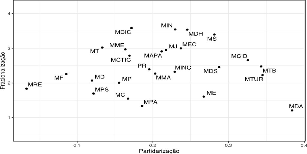 In this study, we explore novel data concerning party affiliations within ministries to characterize political-party appointments in high and mid-level bureaucracy from 1999 to 2018. We argue that party cleavages within these organizations hold significant importance. To scrutinize the variance among ministries, we propose an index of intra-ministerial party fractionalization. By emphasizing the distinction between party politicization and fractionalization as separate dimensions that vary significantly among ministries, our argument underscores the importance of intra-ministerial party cleavages in understanding government dynamics and the relationship between federal Executive power and Legislative branches. Furthermore, we contend that paying attention to political-party divides within each ministry has been an overlooked dimension in the analyses of governmental processes and Brazilian coalition presidentialism. Nevertheless, it stands as a pivotal factor for success in navigating relations with the Legislature and identifying hurdles to effective governance of federal public policies.