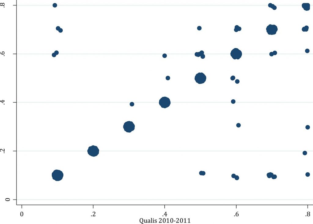 In this study, we seek to contribute to discussions on how the quality of academic production in the field of political science should be evaluated using Brazil as a case study. We contrast the ‘expert-driven approach’ that is followed by CAPES, an agency of the Brazilian federal government with the ‘citational’ approach, which is based on the ranking of journals by mainstream indices of scientific research impact. With data provided by CAPES from 2010 to 2014, we examine to what extent journals that are ranked as having high quality by CAPES also have high impact indexes in the SCImago Journal rank index (SJR), the Hirsch index (h-index) calculated by SCImago, the h5-index and h5-median (based on the h-index period 05 years, calculated by Google Scholar Metrics), and the SNIP indicator (calculated by the CWTS Journal Indicators, included in the Scopus database). Our findings show that there is a positive, but weak correlation between citational criteria and the Qualis evaluation of the same journals. In ordered logistic regressions, we show that a journal’s past Qualis scores are the most important factor for explaining its grades in the next evaluation. We show that once a journal’s past Qualis score is considered, a journal’s citational ranking does not influence its Qualis score with the exception of the SJR in the 2013-4 evaluation. Moreover, a journal’s Qualis score is not influenced by the country of publication, language, or social science focus, all else equal.