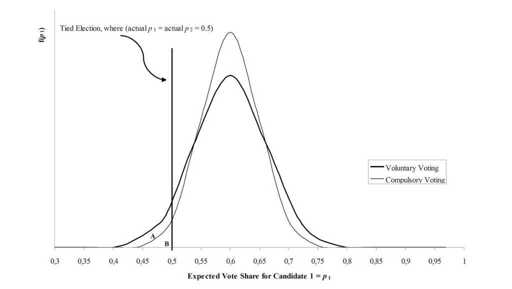Many observers have expressed concern that low voter turnout reflects an acute shortcoming in democratic politics. One proposed remedy, making voting compulsory, has garnered increasing attention among academics over recent years. Our article focuses on some of the technical properties of compulsory voting rules (CVR) while ignoring the philosophical debate over whether voting should be an obligation or a right. Using basic probability analysis, we compare a voluntary voting rule (VVR) to a compulsory one. We show that, under certain conditions, an electoral seat or district can become safer – or less competitive – with the imposition of a CVR. We also discuss some political implications of our analysis. For example, when generalized to, say, the national political system, this result implies fewer competitive seats in a CVR compared to a VVR, everything else equal. We contend that, because fewer seats will be “in play” in a CVR, CVRs should exhibit lower turnover of seats. Also, political suppliers can be expected to more narrowly focus their attention – and resources – on this smaller set of competitive seats than we would expect under a VVR.
