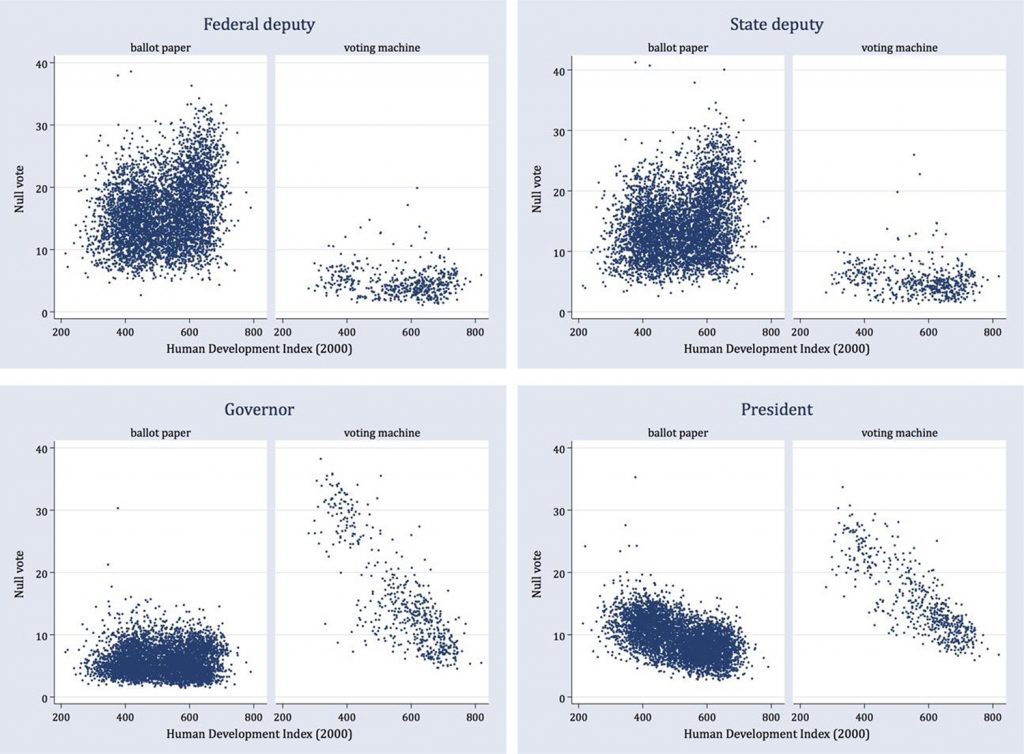 Electronic voting machines were used for the first time in general elections in Brazil in 1998; in that year, some cities used this new voting method, while others continued to vote using paper ballots. Few studies have demonstrated that the rate of invalid votes for federal deputy was significantly lower in cities that used electronic voting machines. This article analyzes the frequency of null votes and blank votes for four posts—federal deputy, state deputy, the president and governor. Based on a comparison of the results from the 1998 elections with the results from previous elections (1994), the article demonstrates that electronic voting machines reduced the percentage of blank votes for federal deputy, state deputies, the president and governor. Meanwhile, null votes reduced the competition for the posts of federal deputy and state deputy; however, it increased the competition for posts with greater visibility in the Brazilian political system: the governor and president.