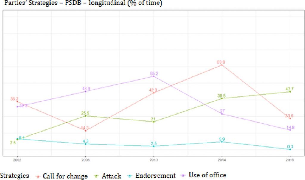 A longitudinal analysis of the use of televised electoral advertising by the two political parties that have been the central actors in presidential elections in post-democratization Brazil: the Workers’ Party (hereinafter referred to using the Portuguese acronym the ‘PT’) and the Brazilian Social Democracy Party (hereinafter referred to using the Portuguese acronym the ‘PSDB’). Our objective is to identify patterns and changes in Brazilian electoral advertising between 2002 and 2018 with reference to Brazil’s system of free electoral advertising time (hereinafter referred to using the Portuguese acronym ‘HGPE’), more of which has been allocated to these two parties than to any other. Despite the increasing use of other forms of electoral campaigning, HGPE is central to presidential contests and demarcates political time and parties’ agendas. It is therefore relevant to understand how use of this campaign component has been developed over time, taking into account two factors: messages and strategies. Our quantitative content analysis considers 90 days of PT and PSDB block format advertising during the first rounds of five election contests. Our results reveal that changes in messaging tend to be decided on by the parties (with the PT emphasizing public policies and the PSDB emphasizing image building) whereas the strategies employed depend on the context of each election and are less specific to either party.