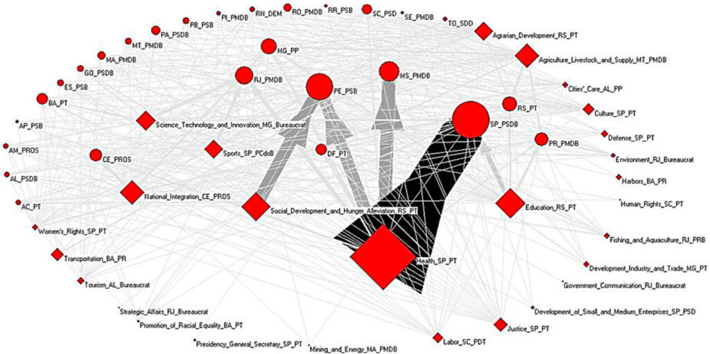 In multiparty presidential regimes, the head of the Executive manages a heterogeneous political base through a series of instruments. Among these tools, the use of patronage in appointments for governmental positions and the deployment of pork barrel to please congressional representatives have been highlighted by the literature as the glue that holds together multiparty coalitions. However, current studies neglect the role of politicians as active actors in multiparty presidential regimes in channeling resources to their constituencies and parties when holding a cabinet position. This paper contributes to the literature by merging these two tools of coalition maintenance. We analyze a complimentary strategy that benefits party leaders in the coalition by studying the relation of top-level cabinet appointments and grant transfers to subnational governments. Using data from Brazil, a paradigmatic case of multiparty presidential regime, we intend to answer the following question: Are ministries in Brazil being used to please ministers’ constituency and party allies? Using social networking analysis and econometrics for the period between 2011 and 2014, we provide evidence that ministers use their position to transfer funding to districts governed by fellow party members and not to their own political strongholds following a partisan pattern instead of a personal one.