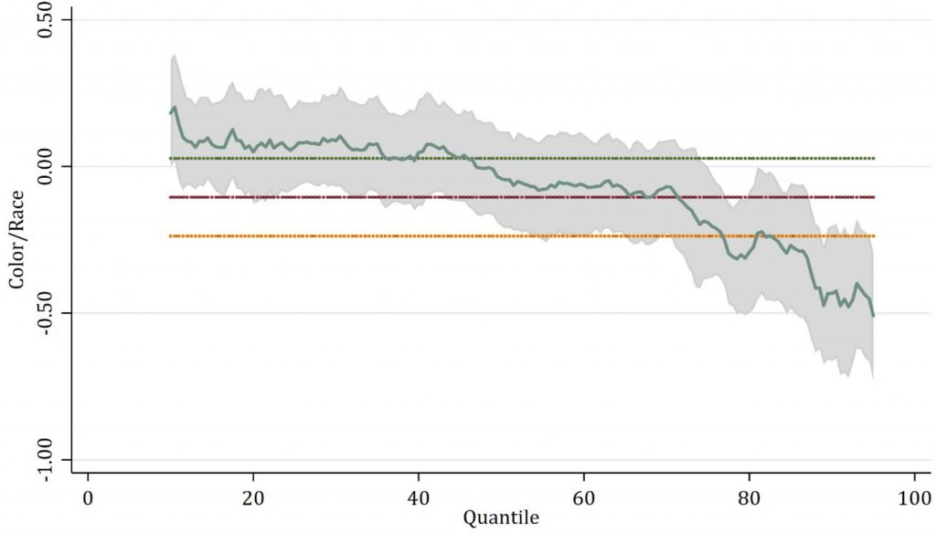 Although the proportion of black, brown and indigenous electoral candidates in Brazil is close to the proportion of blacks, browns and indigenous in the general population, the proportion elected to the country’s Federal Congress is significantly lower. Statistical techniques such as linear or logistic regression are typically used to estimate the effect of a particular variable such as color/race or gender on a candidate’s electoral performance. However, in Brazilian elections, characterized by substantive, asymmetrical differences such as extreme variations in campaign finance distribution, the efficacy of these types of regression models is limited. Such being the case in Brazil’s open list proportional representation system, we propose quantile regression as the most suitable means for estimating the relationship between voting and other variables such as race/color, because it enables us to estimate relationships between the variables of interest across several distribution quantiles. Quantile regression models show that black and brown candidates get as many as 40% fewer votes than white candidates in higher vote distribution quantiles. Furthermore, analysis of access to campaign financing finds that black and brown candidates on average garner only 75% of the funds available to white candidates at quantile 80 of campaign finance distribution. This drops to 65% at quantile 90.