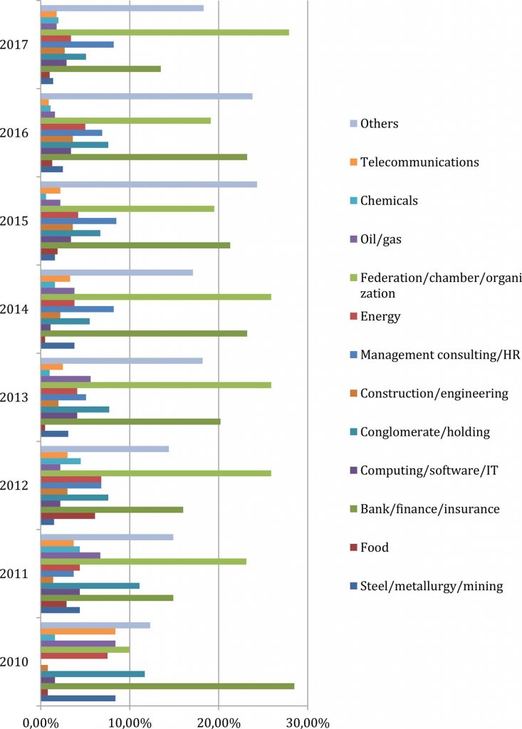 The 2008 financial crisis stands out for being a crisis that occurred not in developing countries, but in the core capitalist countries, thus assuming greater proportions and with broader ramifications. In this context, the G20 gained new impetus, and, as a result, several studies have sought to understand not only the crisis but the role of the reformed G20 in the process of resolving it. Despite the relevance of this literature, little attention has been paid to the G20 outreach process, in particular to the growing dialogue established between the G20 and B20 (Business Summit 20), a group that represents the business sector in these exchanges. This article seeks to contribute to a better understanding of the engagement of business elites with the actions taken by the G20 to deal with the 2008 financial crisis – that is, the role of social forces in the (re)construction of contemporary international political economy. It seeks, in a concise and exploratory way, to sketch the relationship between the B20 and G20 in the period between 2010 and 2017, in order to better understand processes associated with the transnationalization of the capitalist class. It starts from the hypothesis that during this period it is possible to identify the constitution of a ‘B20 Nucleus’, constituted by the business sectors present at most B20 summits, and to a large extent based in the countries of the North Atlantic. In this sense, the B20 acts as a point of integration for the global corporate elite.