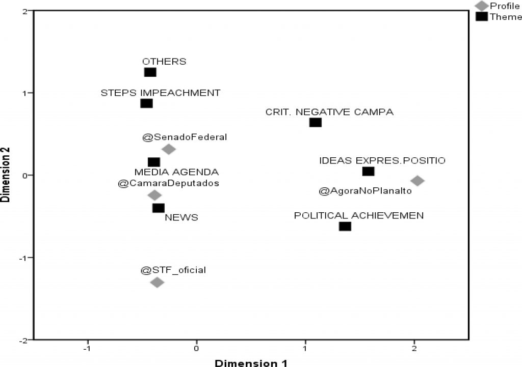 The objective of this article is to analyze the content of public communications in situations of political crisis. We aim to establish whether and to what extent there was partisan instrumentalization of the digital social media channels administered by State institutions during the impeachment of Dilma Rousseff. We analyzed all posts published between 2015 and 2016 on the official Twitter profiles of Brazil’s Chamber of Deputies, Federal Senate, Presidential Palace and Federal Supreme Court. We considered all posts with the words ‘impeachment’, ‘impedimento’, (‘impeachment’) ‘afastamento’, (‘impeachment’) and ‘golpe’ (‘coup’) (n=795). Our methodology comprised a combination of quantitative (descriptive statistics) and qualitative (content analysis) strategies. We found that the Federal Senate’s twitter profile most frequently posted the word ‘impeachment’, while the term ‘golpe’ was most frequently posted by the Presidential Palace profile. Over half of the publications fit into the category of ‘dissemination of news’. The Presidential Palace’s Twitter profile exhibited a distinct pattern of behavior, predominantly posting tweets associated with the ‘promotion of ideas and expression of positions’. Therefore, the Presidential Palace favored a communications strategy with a partisan bias. This research is relevant as it uses empirical data to discuss phenomena tied to studies on public and political communication.